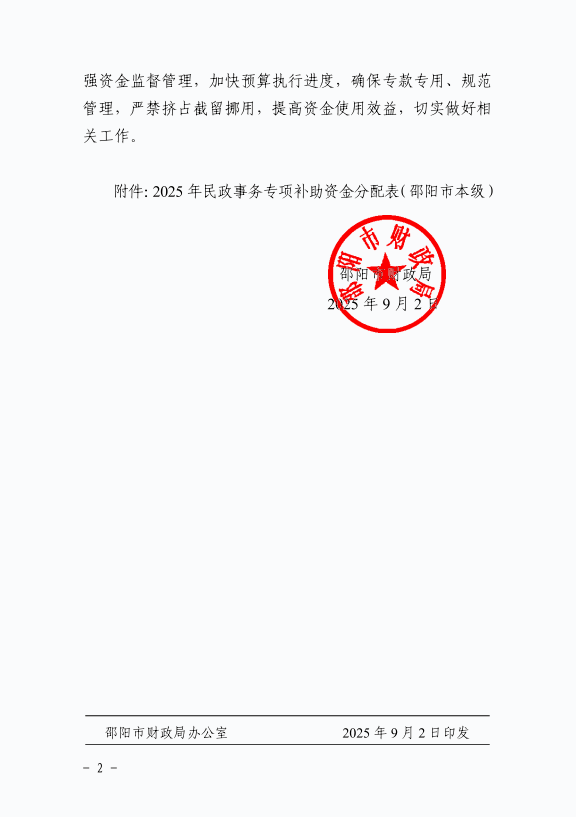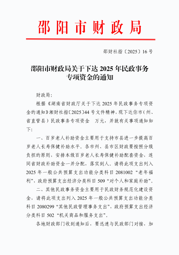 邵阳市财政局关于下达2025年民政事务专项资金的通知