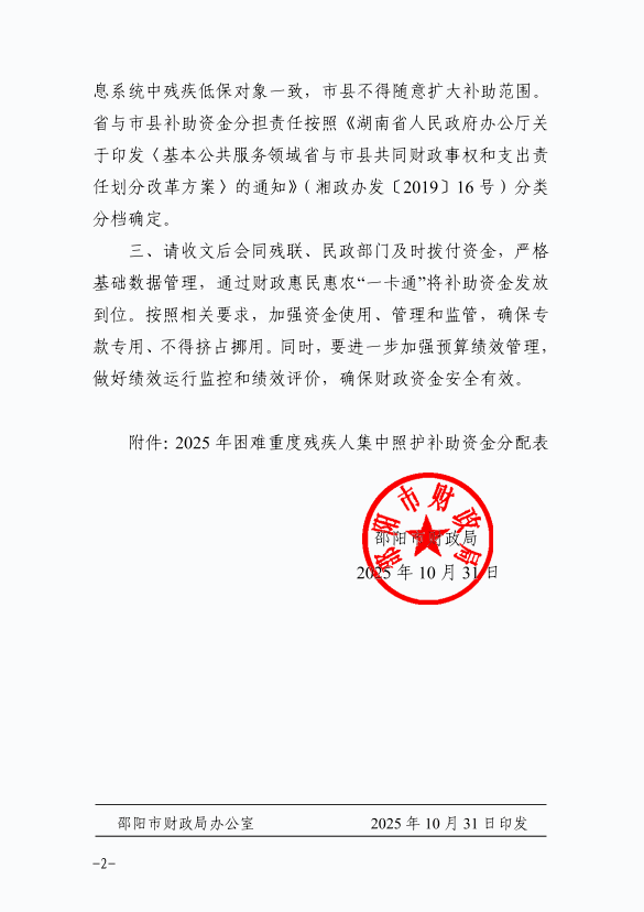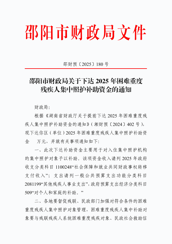 邵阳市财政局关于下达2025年困难重度残疾人集中照护补助资金的通知