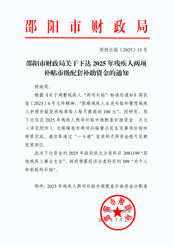 邵阳市财政局关于下达2025年残疾人两项补贴市级配套补助资金的通知
