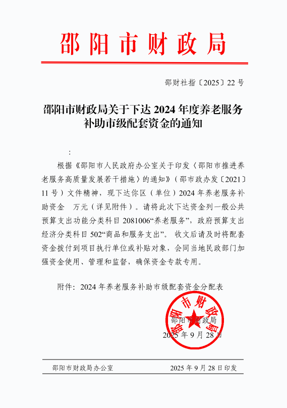 邵阳市财政局关于下达2024年度养老服务补助市级配套资金的通知