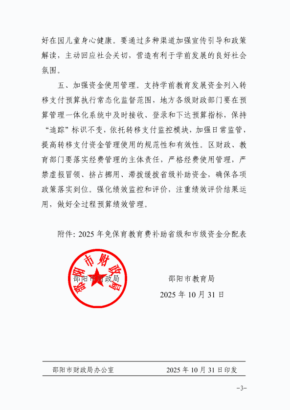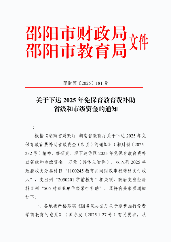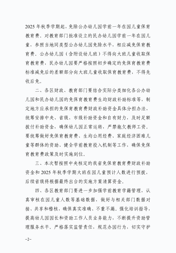 关于下达2025年免保育教育费补助省级和市级资金的通知